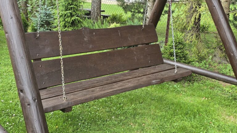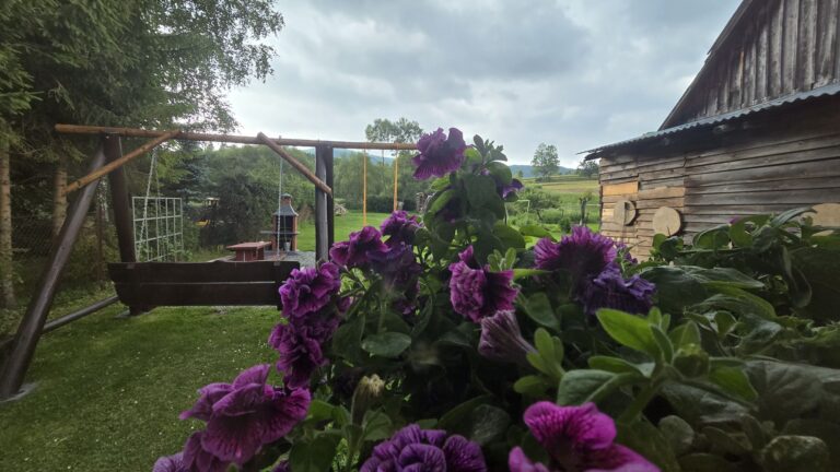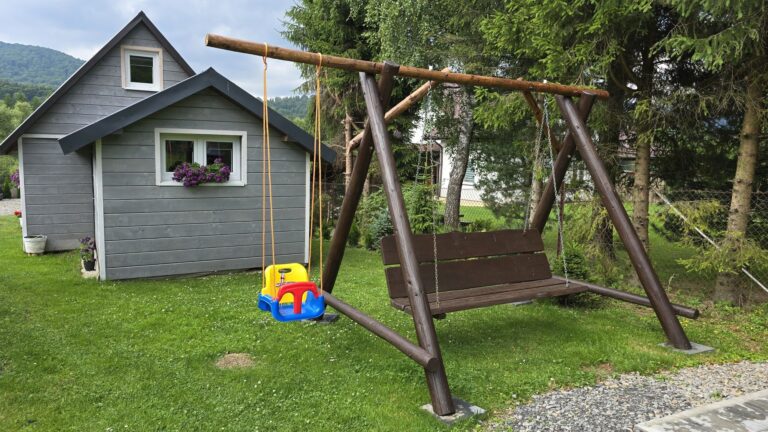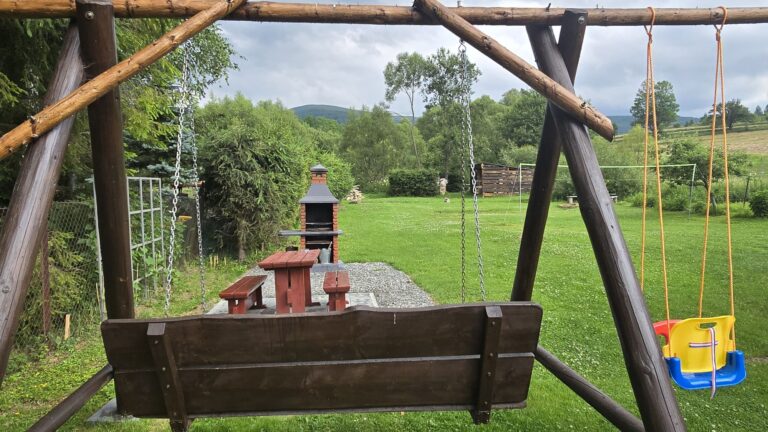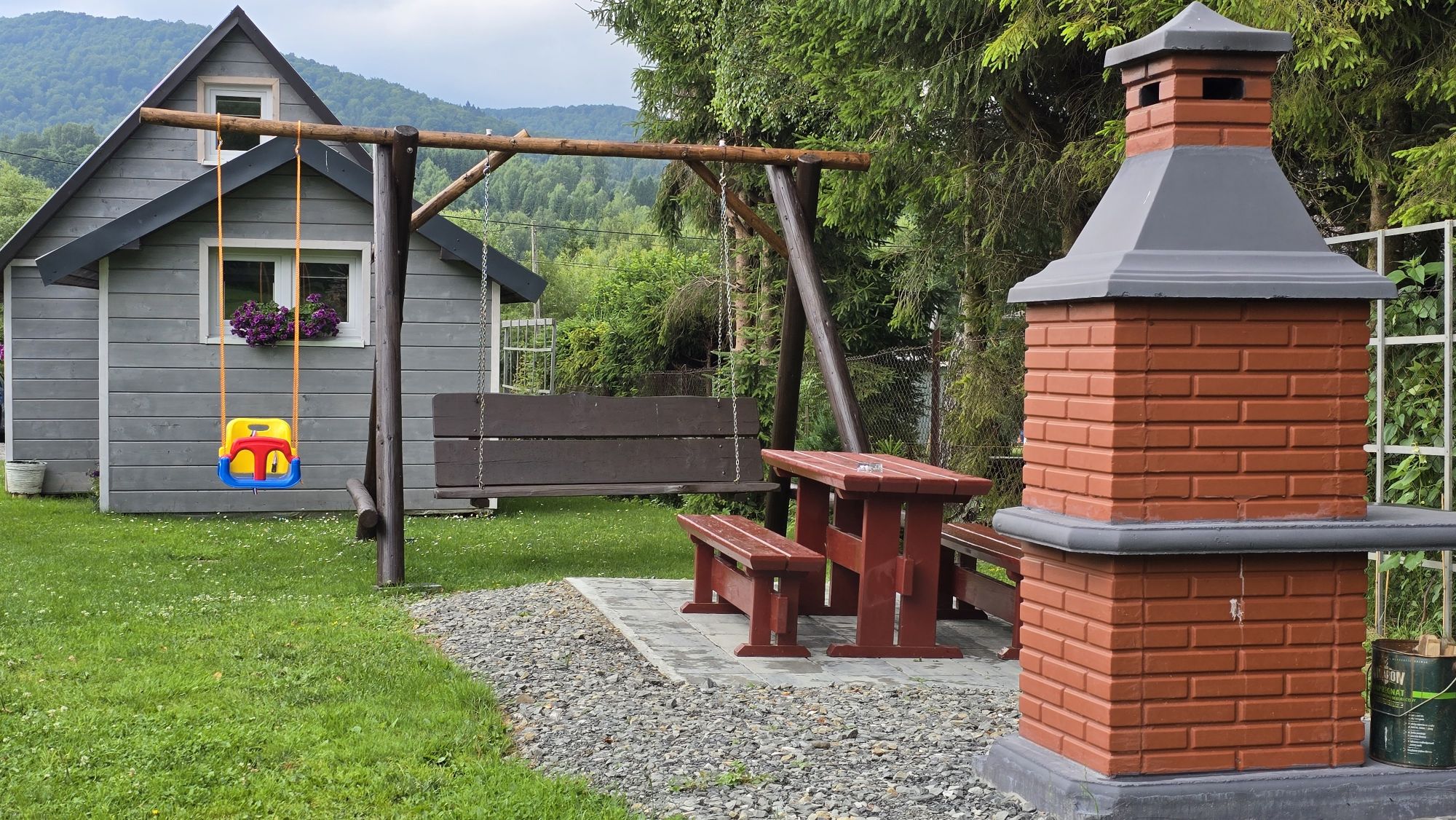 Strefa relaksu: miejsce na ognisko, grill ogrodowy, ławki ze stolikami, huśtawka z widokiem na górę Smerek
